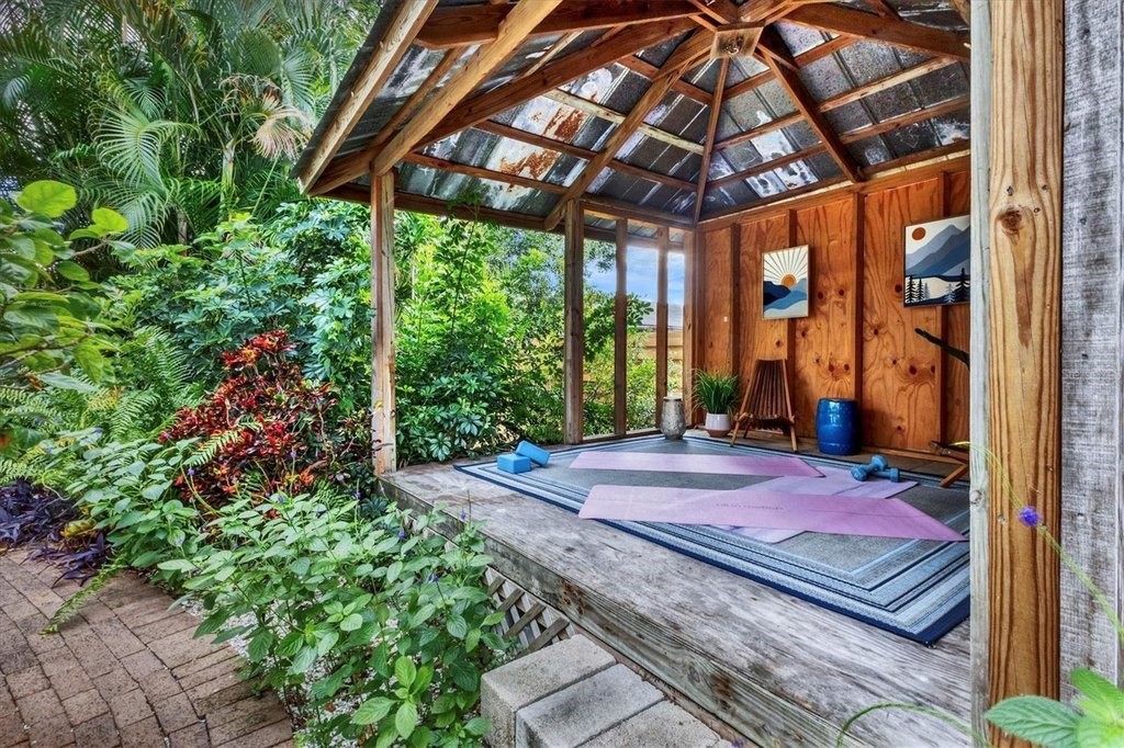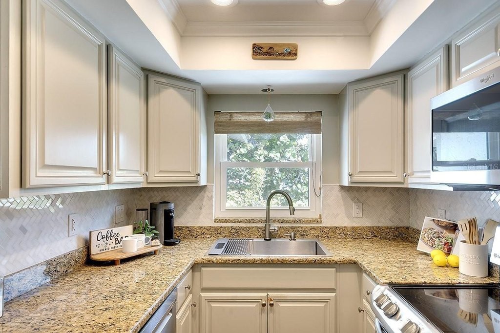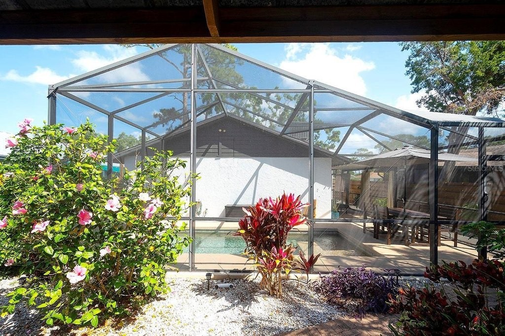 Back on The Market! With New & Upgraded Septic System (Installed Sept 2025) This Nature Lovers Retreat AS SEEN ON THE RECENT HGTV EPISODE OF MY LOTTERY DREAM HOME, Season 18 Episode 5, this beautifully updated craftsman-style home offers 1,048 sq. ft. of living space and a modern, open floor plan with vaulted ceilings creating a bright and spacious feel. Updates include seamless Luxury Vinyl Flooring throughout and Custom room-darkening shades. Entertaining or just making a stay at home dinner is a delight in the gourmet kitchen with granite countertops, herringbone backsplash, large single-basin sink, stainless steel appliances (including double oven) and butcher-block breakfast bar with foot rail, with an added bonus, the hanging spice garden that conveys makes fresh and tasty meals a daily delight. The charming built-in corner dining bench (conveys), Remodeled bathrooms (previous owner), Primary bedroom with vaulted ceiling, Guest bedroom includes custom Murphy bed with built-in desk and shelving—perfect for a home office, Newer A/C (2021) with UV light for improved air quality, High-end hybrid water heater and LED lighting throughout. Private PebbleTec heated saltwater pool (2019), Expansive covered lanai with multiple seating areas, Fenced yard (2024) with attractive woven wood fence and hanging spice garden, Treated wood walkway newly added (2025) leads to private backyard. Stay in shape or enjoy some Zen from your own elevated and covered yoga/meditation platform with attached storage shed, Mature trees maintained by a licensed botanist—home to many bird species, HURRICANE IMPACT WINDOWS & DOORS, Flood Zone X – No Flood Insurance Required, One-car air-conditioned garage (formerly 3rd bedroom – easy to convert back), Newer garage door (2021), Newer washer & dryer (2021), PIPES COMPLETELY LINED WITH PVC (2024), Grading & gutter system (2024) for proper drainage, Roof (2011) with wind mitigation (2022), Public water + brand-new septic system (2025). Conveniently located near shopping, dining, Siesta Key Beach, Oscar Scherer State Park, and The Legacy Trail. This move-in-ready home offers modern comfort, quality updates, and the best of Florida living—all in one exceptional property!